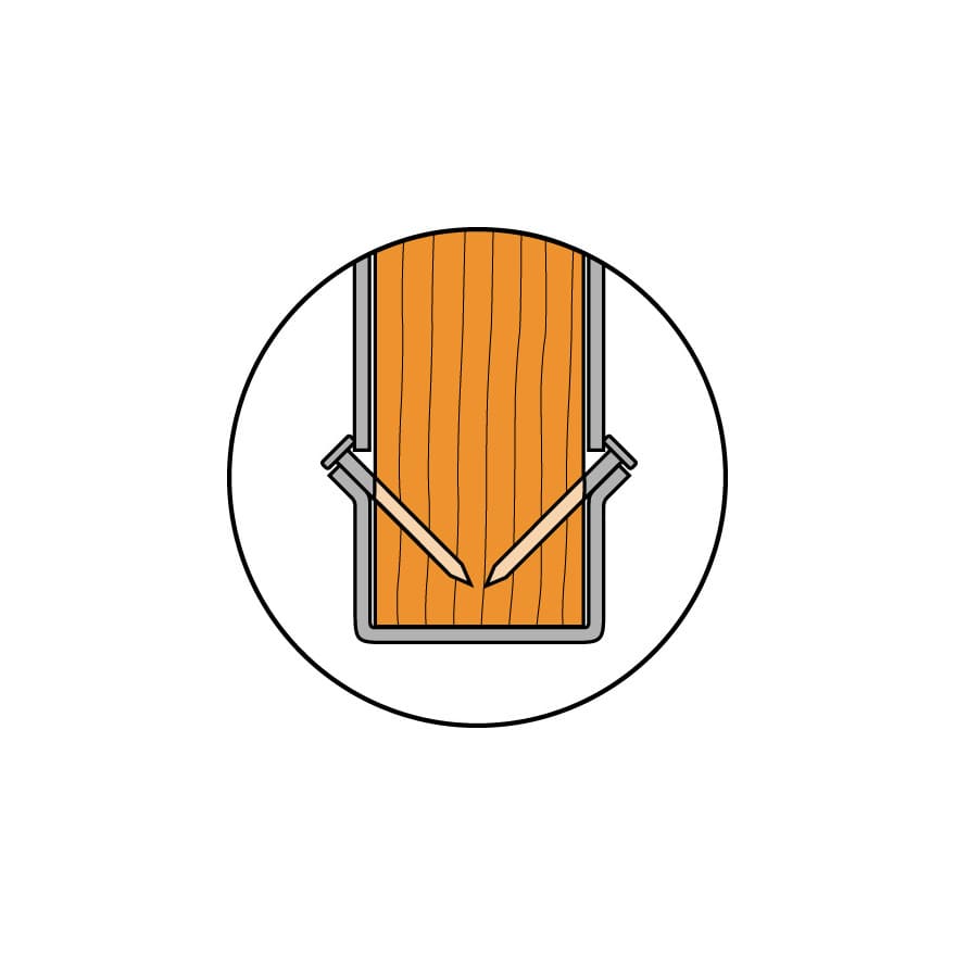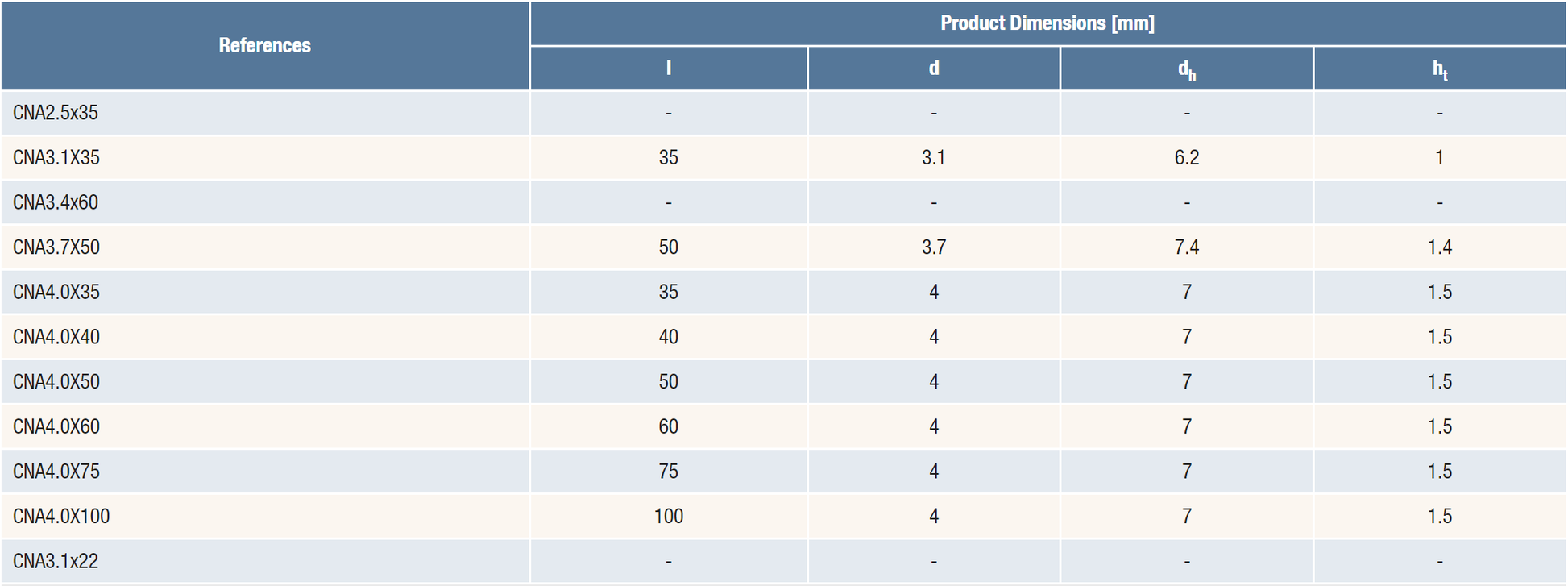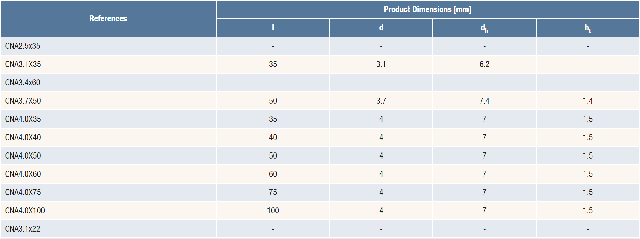 12µm galvanized steel connector nails. The CNA nails are ribbed connector nails with a tapered shape. These nails are recommended for the installation of structures and for the installation of Simpson Strong-Tie connectors, angles, and other connections to timber materials to ensure structural stability. The nails have undergone all necessary testing to be used in all construction projects requiring CE and ETA certifications.