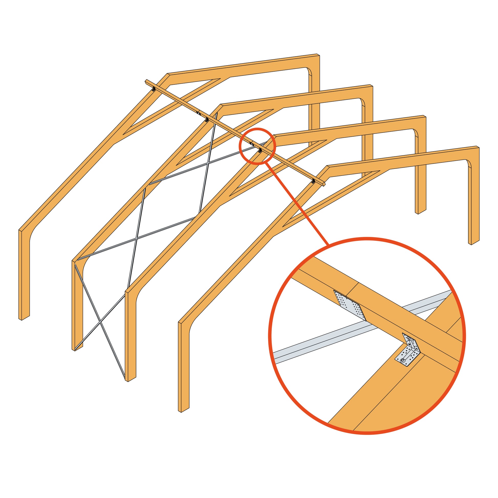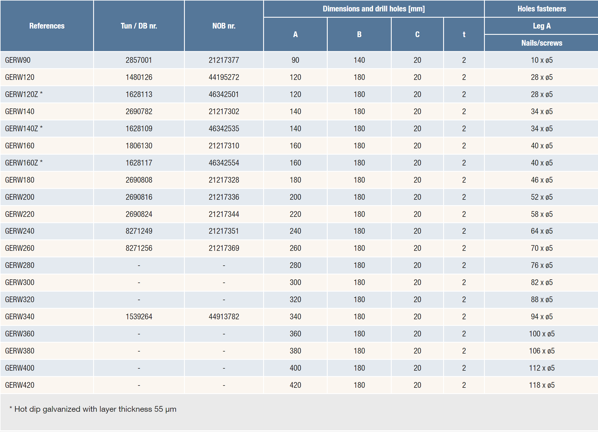 Galvanized steel 55 µm. The GERW connectors are suitable for standard truss beams. Additionally, the shear forces in the vertical direction can absorb forces in the beam direction, making them suitable for force transfer. Depending on the load, both partial and full nailing can be utilized.