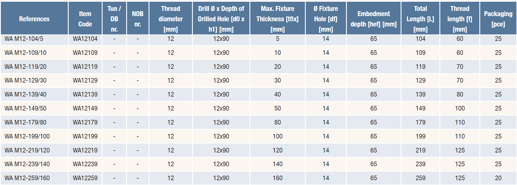 Full product technical specification on the manufacturer's website: Wedge Anchor Bolt - WA | Simpson Strong-Tie (strongtie.lv)