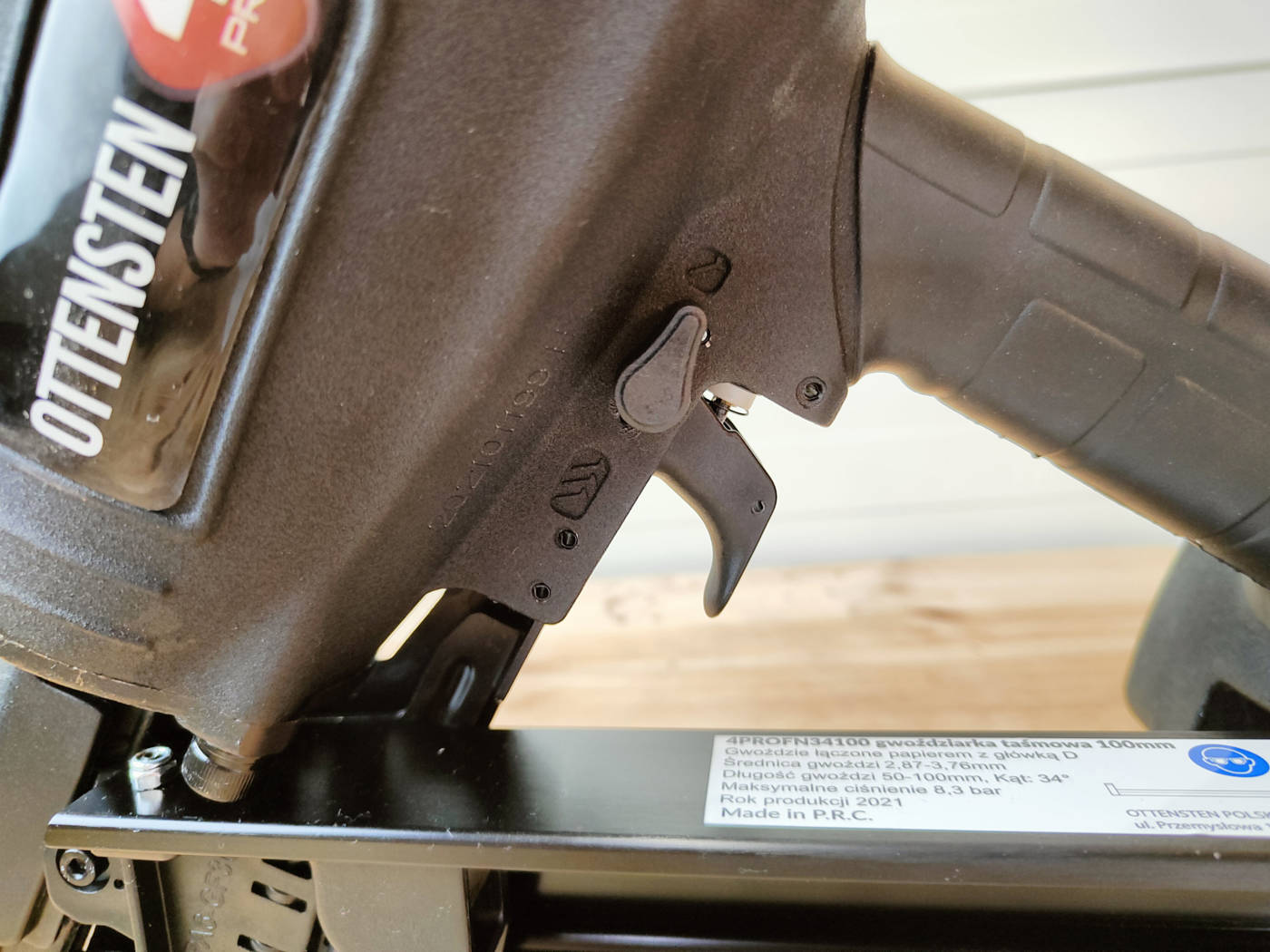 4PRO FN34100 can drive nails ranging from 50-100 mm in length with a D-type head. Importantly, when working at height, the tool's lightweight design (only 3.88 kg) ensures comfort, ease of use, and an enhanced level of safety. A distinctive feature is the one-piece piston and open guide design for easy removal of jammed nails. The ergonomic rubber handle allows for comfortable and simple operation, even during extended use. It is possible to adjust the nail depth of drive and select between single or sequential firing modes.