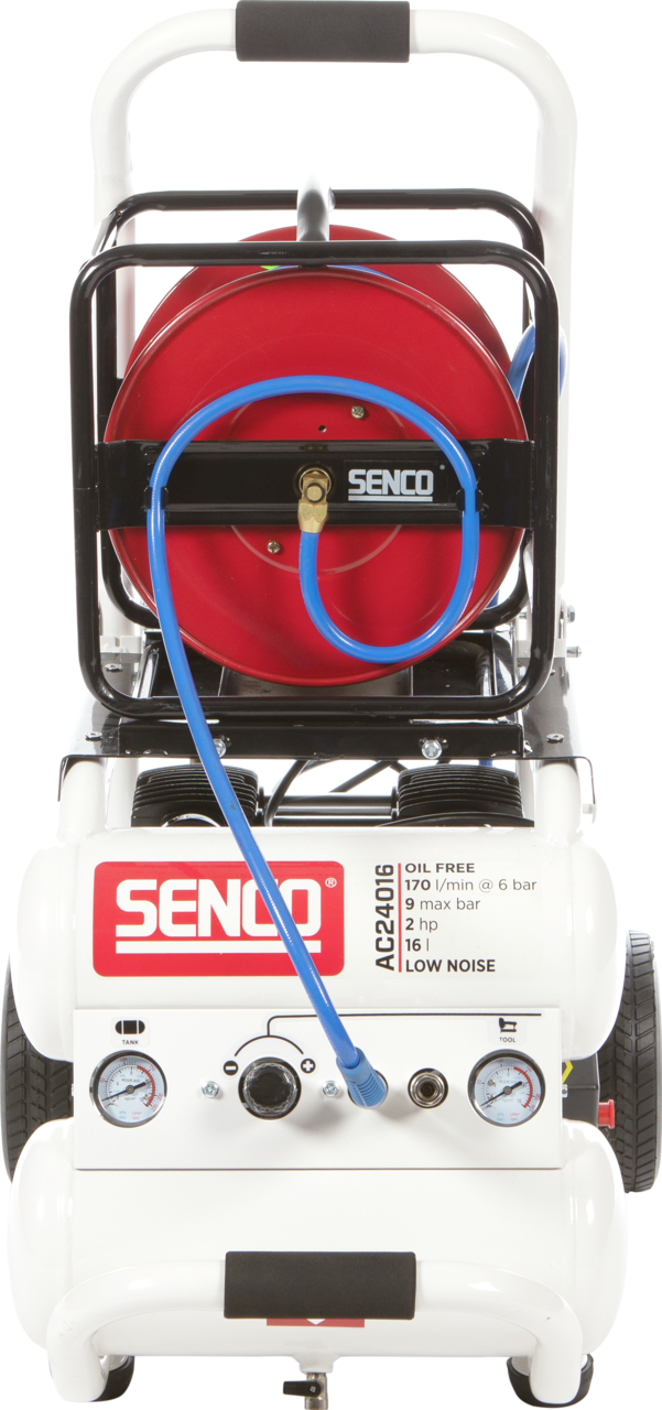 The SENCO AC24016 compact compressor with wheels is an ideal low-noise, oil-free solution for all types of construction work. With a reduced noise level (only 70 dB) and minimal vibration, it is suitable for operation in close proximity to the operator. The compressor features the option to connect a SENCO hose reel, facilitating its movement and use. It is the perfect solution for cladding work, side cladding, upholstery, and wooden constructions.