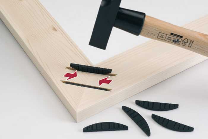 E20 is a self-locking element that can be used with any Lamello biscuit jointer. The E20 is driven into a 4 mm profile using a hammer. During installation, it compresses the workpieces together. The E20 serves as an ideal aid for gluing in the workshop or on-site. E20-L is suitable for surface connections, such as picture frames, panel extensions, etc.