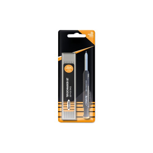 The marker is equipped with a retractable metal tip and an integrated sharpening cap, allowing for a fine writing surface for accurate markings. The set also includes an additional refill box with six graphite rods, providing extended use without the need for frequent replacements. A practical metal clip allows for easy attachment of the marker to a pocket or tool belt.