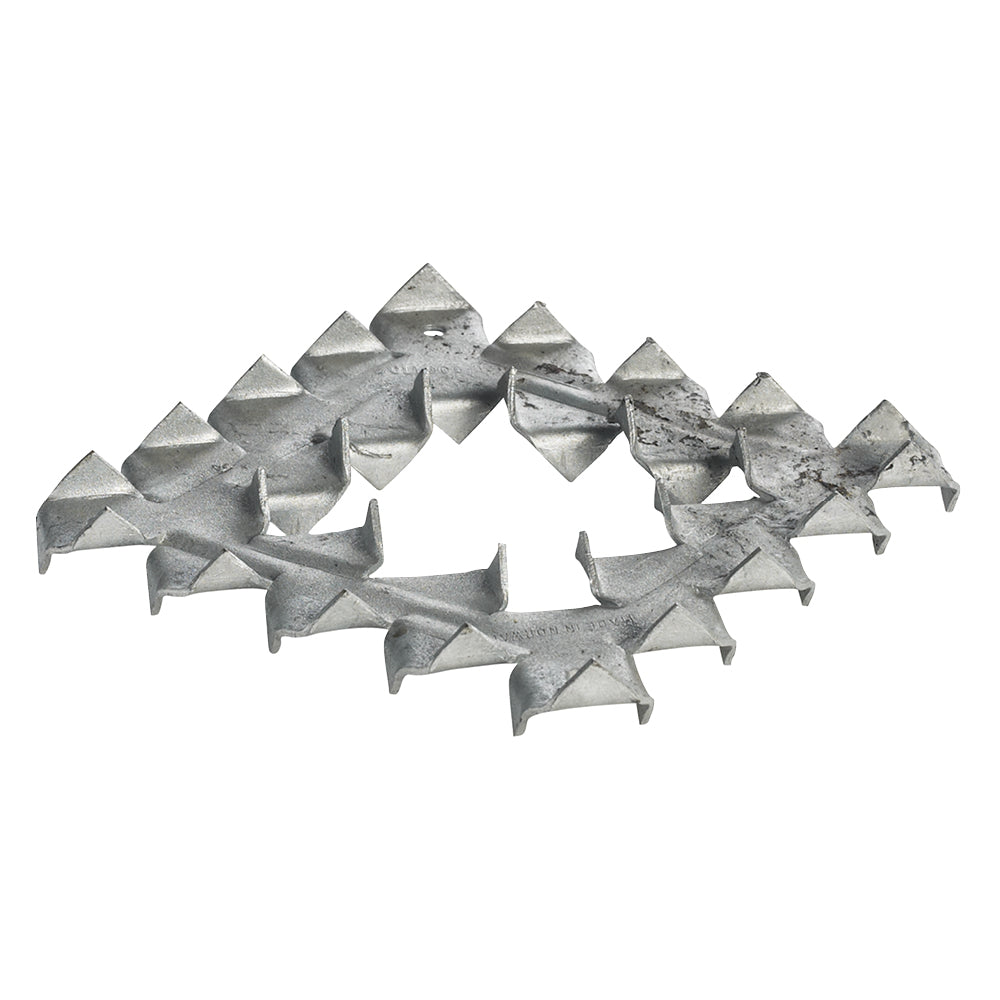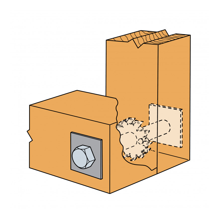 Galvanized steel anchor plate used to connect two wooden materials with a dowel.