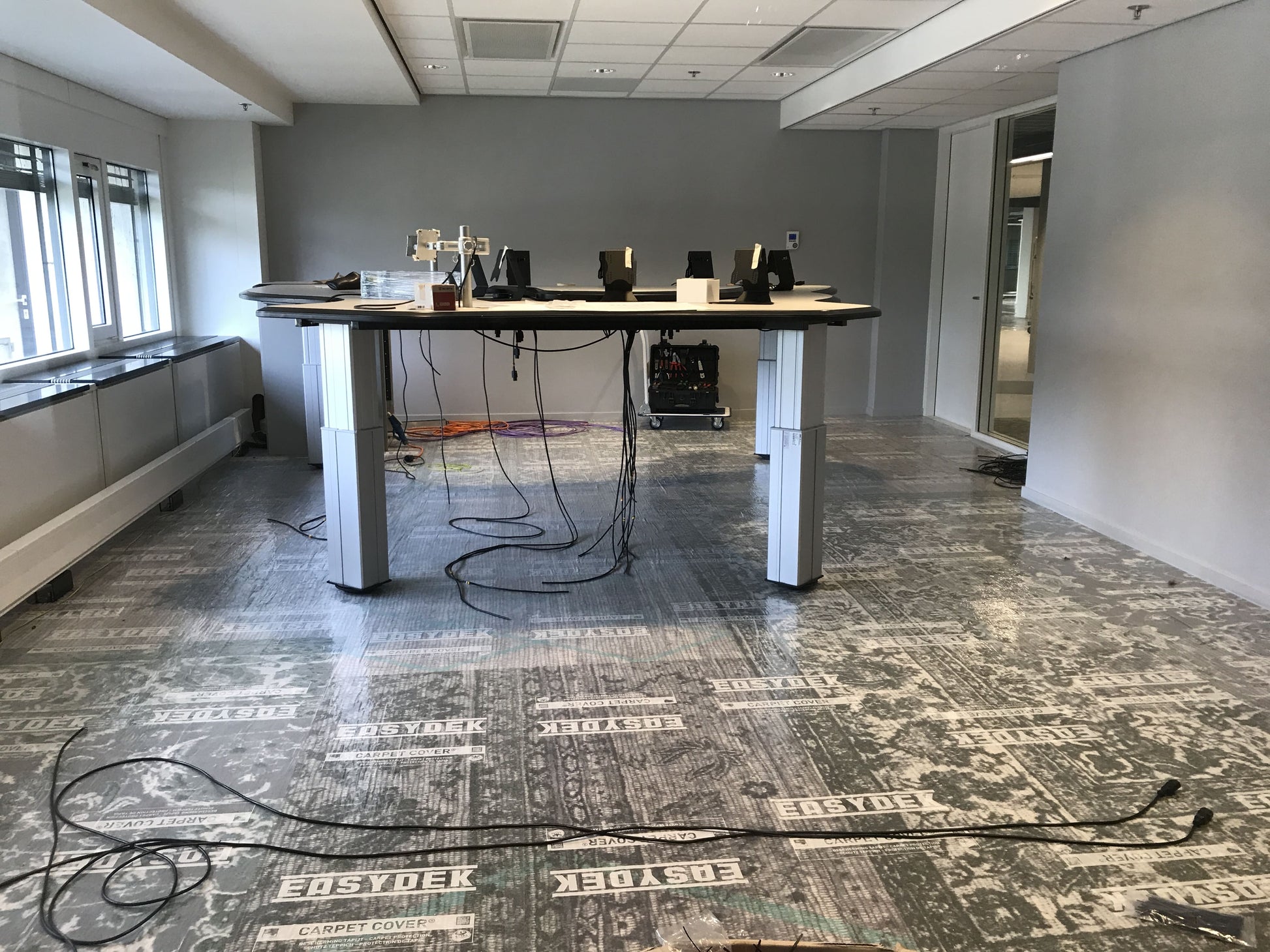 Use the carpet covering during construction, renovation, and maintenance work. Covering the carpet with Carpet Cover is very straightforward. The protective film is rolled up so that the adhesive layer is on the outside. Unroll the carpet covering by hand or foot. For very large areas, use an applicator for quicker installation. After completing the work, the carpet covering can be easily removed. The carpet remains clean.