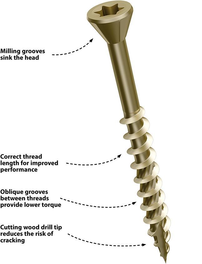The screw pilot ensures that the screw does not split the wood during installation. Pre-drilling is not required. An additional drill located above the thread facilitates easier insertion of longer screws, reducing driving resistance. Recommended screw driving speed is 400-1200 rpm.