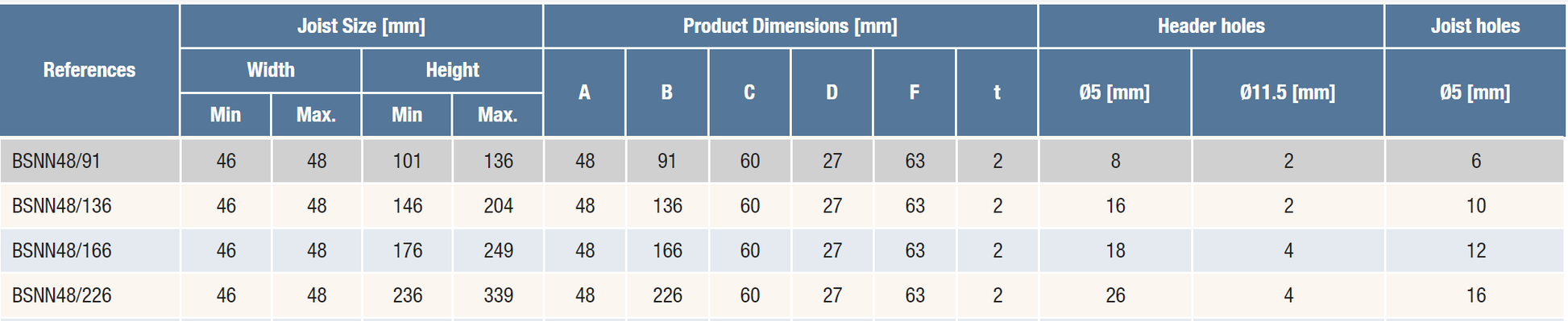 The BSNN series are sturdy brackets designed for use in cases where exceptional durability is required. The hangers are attached using CNA system screws, but their surface also has holes for 12 mm fasteners. The depth of the hanger should be no less than 2/3 of the height of the supported element to avoid structural displacement, unless additional lateral reinforcement is added to the top of the supported element.