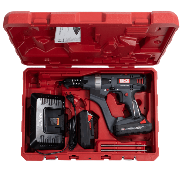 This high torque automatic screwdriver, powered by an efficient brushless motor, consists of two extended operation 3.0 Ah batteries, a variable speed selector for heavy steel, and a quick feed system with our patented angle-adapted technology. The DS722-18V also has a return feed function - the next screw is aligned with the bit for better visibility and easier, more accurate screwing.