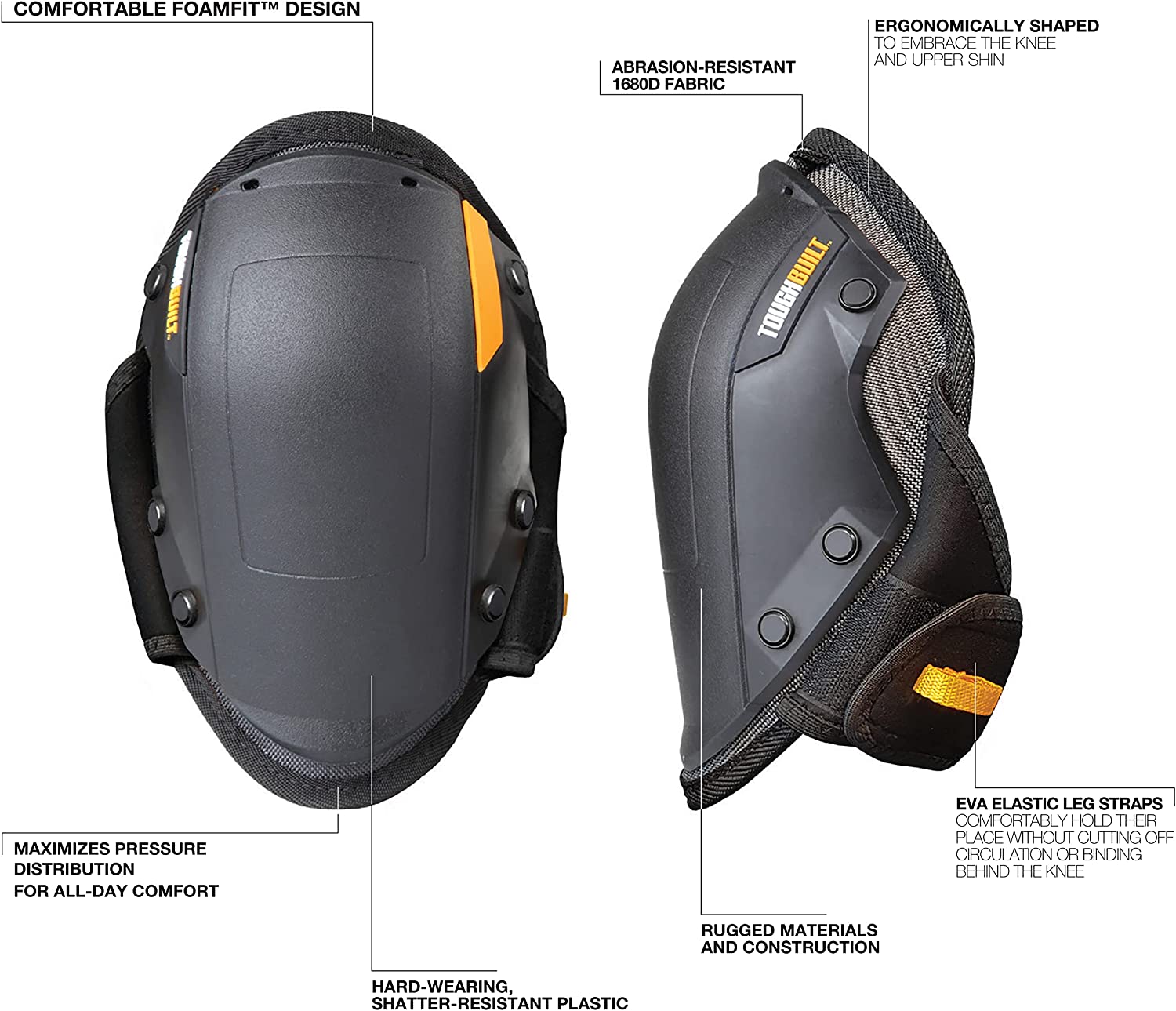 "ToughBuilt FoamFit™ knee pads redefine how professionals use knee braces. The sturdy, tear-resistant SnapShell casing protects the knee from rough surfaces while allowing easy lateral movement. The ergonomic foam construction conforms to the natural shape of the knee and calf, distributing pressure for comfort all day long. High side walls reduce knee twisting. EVA elastic leg straps comfortably stay in place without disrupting circulation and without constraining the ankle. Due to their sturdy materials and construction, these reliable knee braces withstand the most challenging work conditions.