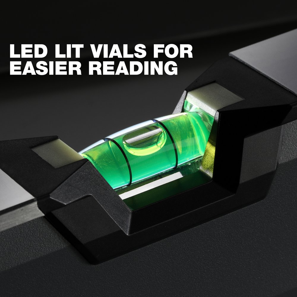 The ToughBuilt 120 centimeter illuminated magnetic level uses LED illuminated vials to make it easier to see the readings.