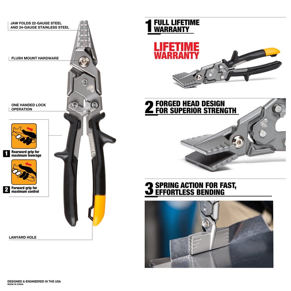 The ToughBuilt 7.6 cm sheet metal bending pliers allow the user to perform duct bends faster and more accurately. They are designed for longevity and extended service life, and come with a warranty for the entire service life.