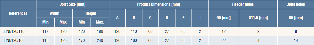 The BSNN series are sturdy brackets designed for use in cases where exceptional durability is required. The brackets are attached using the CNA system screws, but their surface also has holes for 12 mm fasteners. The depth of the bracket should be at least 2/3 of the height of the supported element to avoid structural displacement, unless additional lateral reinforcement is added to the top of the supported element.