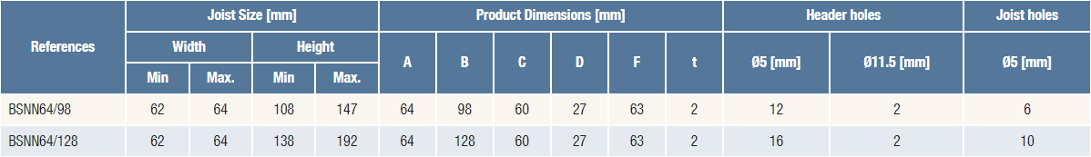 The BSNN series are robust brackets designed for use in cases where exceptional durability is required. The brackets are attached using CNA system screws, but their surface also has holes for 12 mm fasteners. The depth of the bracket must be at least 2/3 of the height of the supported element to avoid structural displacement, unless additional lateral reinforcement is added to the top of the supported element.