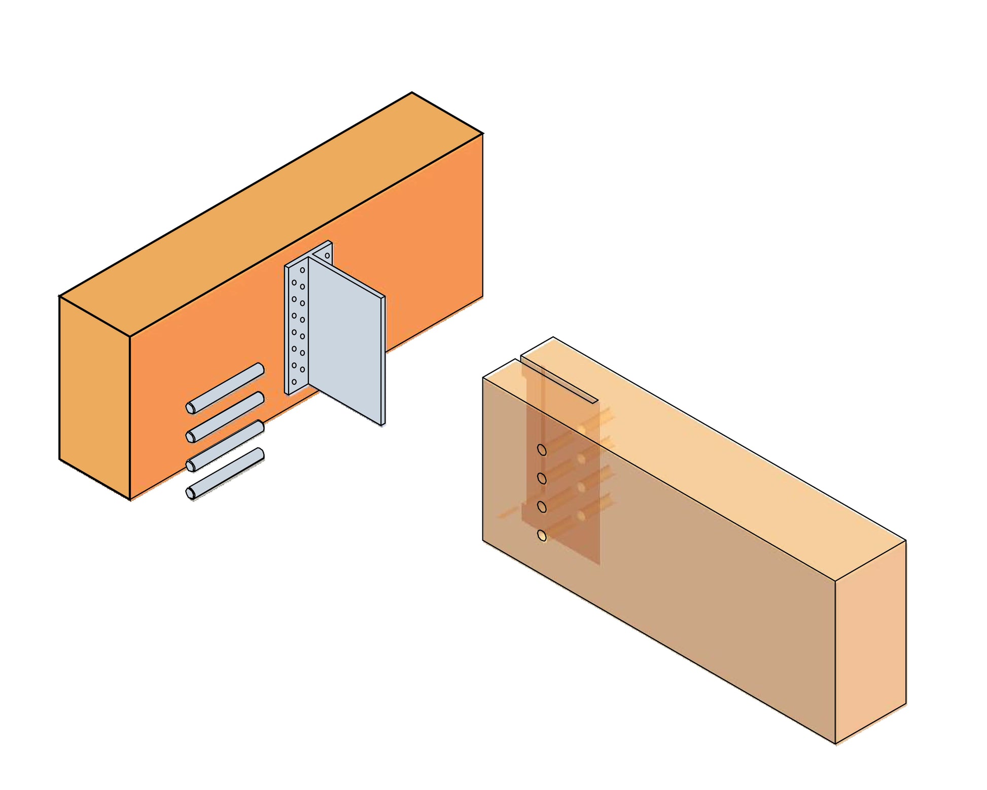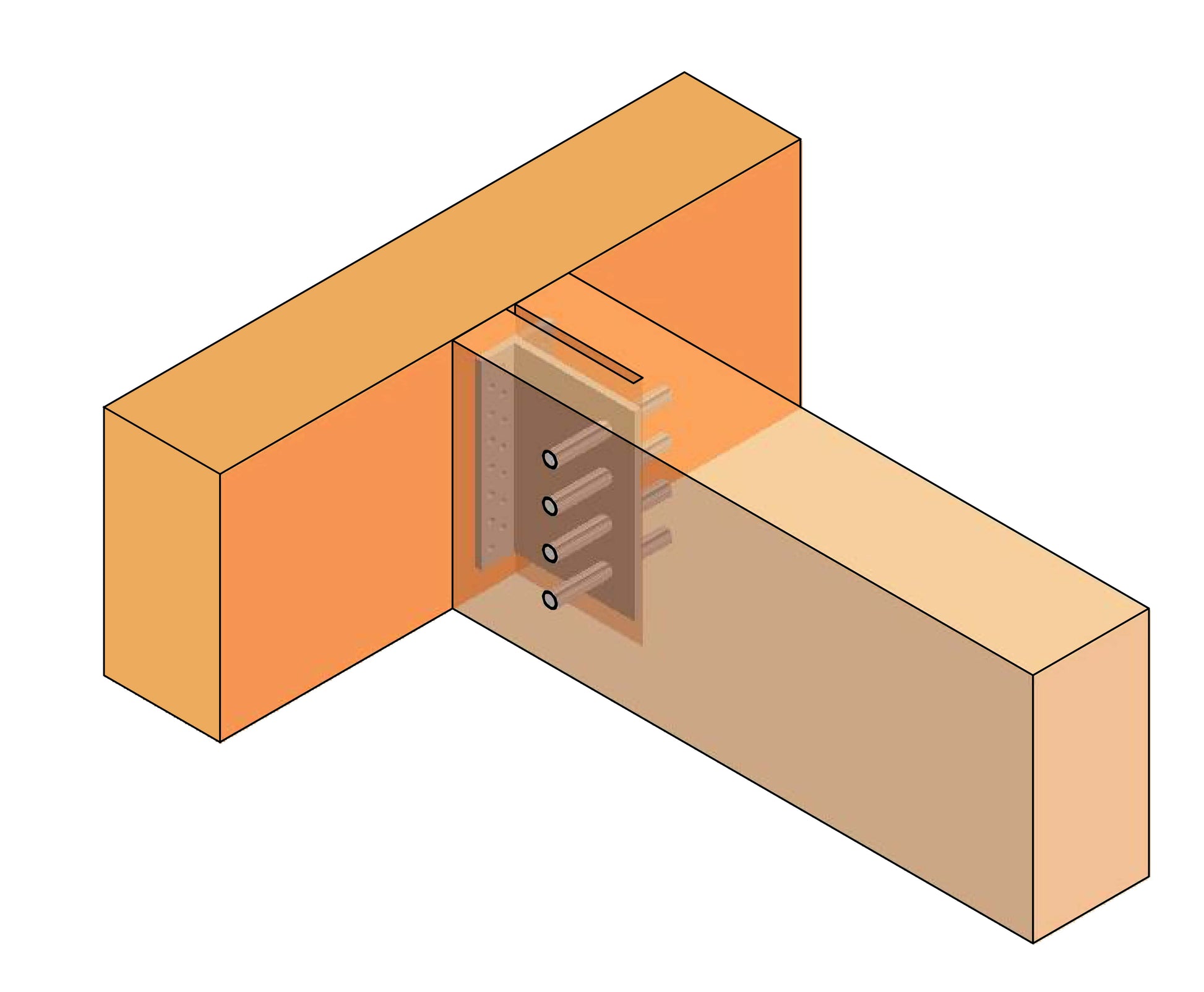 The BTALU concealed hanger is one of the solutions for connecting wooden elements while hiding the joint. The holder is attached to the main structure, then fully inserted into the hole of the incoming beam and secured with wedges. For precise alignment, holes are drilled through the wood and the edge of the BTALU. This method ensures an aesthetically pleasing beam connection.