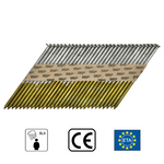 Hot-dip galvanized nails for outdoor applications. The 50-micron galvanized steel is highly resistant to rust, ensuring your projects are durable and long-lasting. The 3.1 mm x 100 mm nails are connected in strips at a 34-degree angle with a paper collated design, allowing for a more compact and user-friendly experience with pneumatic tools. These nails comply with all European Union certifications and are among the most widely used construction nails due to their universal size. The smooth surface of the nails allows for easy penetration into materials with minimal resistance. Nails are available in various sizes with a diameter of 3.1 mm, ranging from 90 mm to 100 mm.