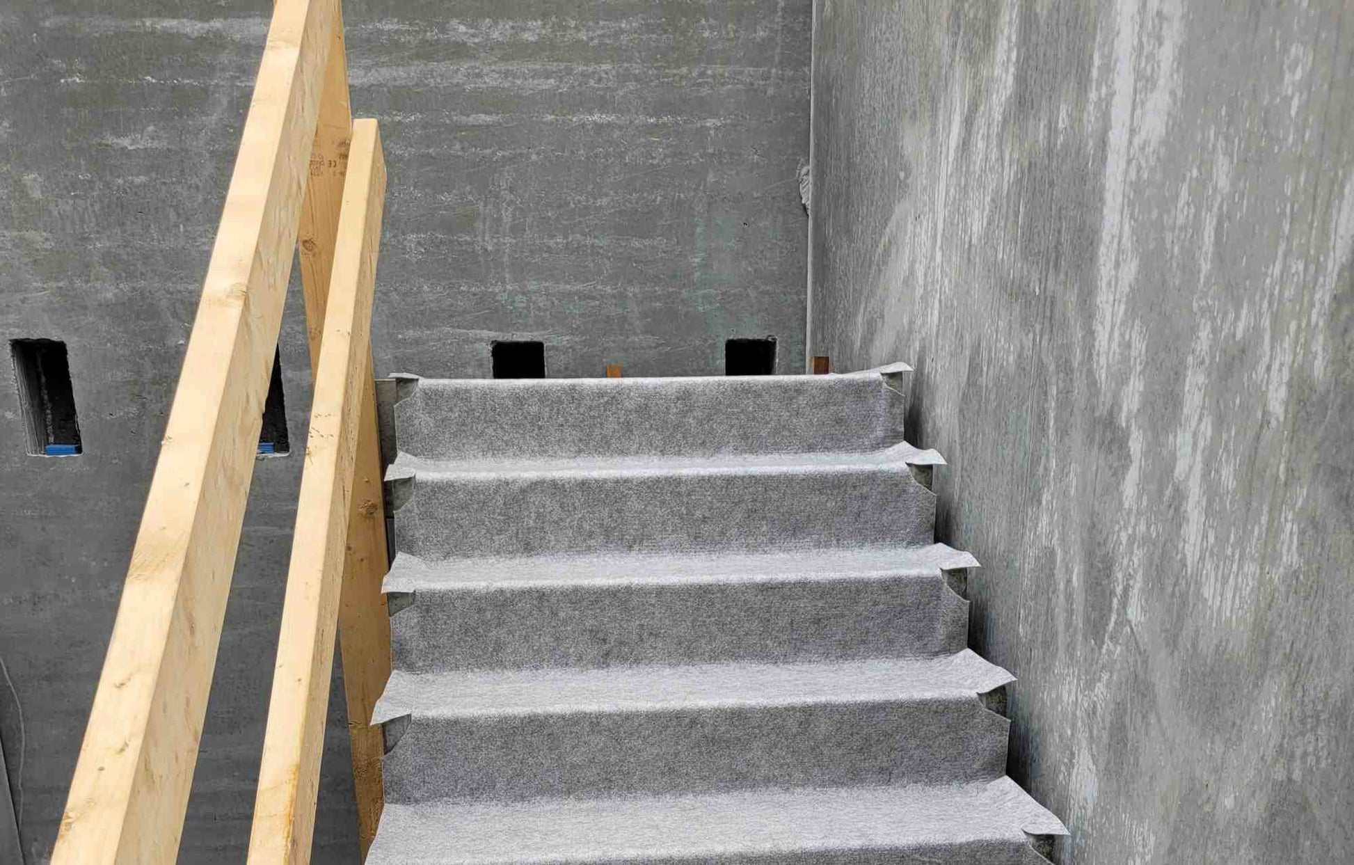 EASYDEK Dura Cover Concrete is an exceptionally durable and self-adhesive temporary protective material with enhanced moisture absorption capabilities and improved slip resistance, designed to provide temporary protection for concrete walls, floors, and stairs. The protective material consists of two layers — the lower layer is moisture-resistant, laminated, and coated with adhesive, while the upper layer is a mechanically durable, liquid-absorbing non-woven fabric. Thanks to its unique adhesive technology, Dura Cover Concrete can be applied both horizontally and vertically, ensuring optimal protection during intensive construction activities. This product is the ideal solution for quickly and effectively protecting walls, floors, or stairs in both vertical and horizontal orientations.