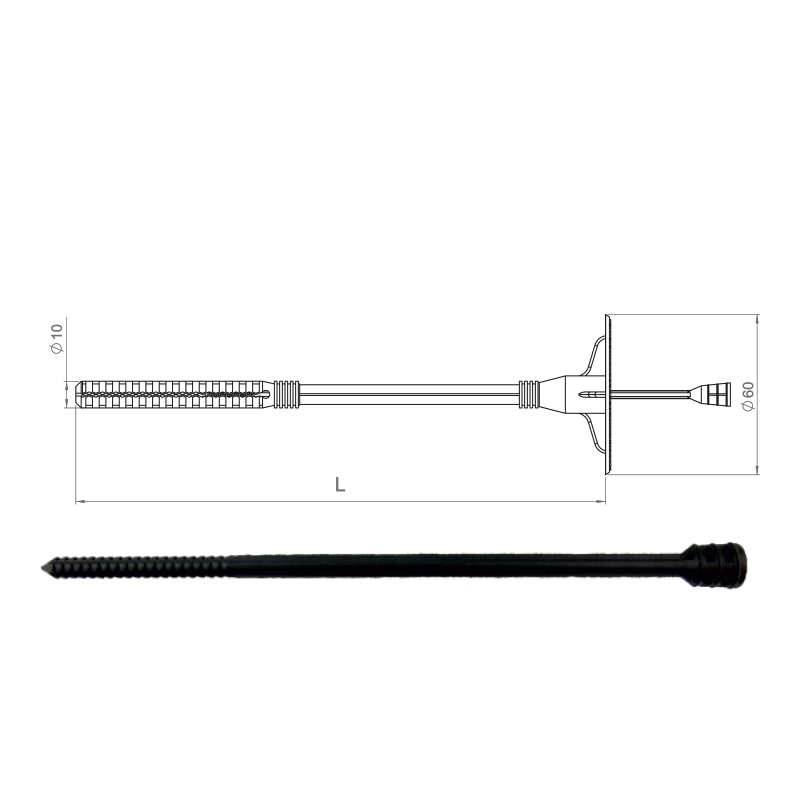 LIPN insulation anchor 10 × 260 mm with plastic (polyamide) nail and extended expansion zone is designed for the mechanical installation of thermal insulation materials (e.g., mineral wool, foam) on various substrates – concrete, bricks, aerated concrete, etc. It is a lightweight yet mechanically robust solution, thanks to the glass fiber reinforced polyamide.