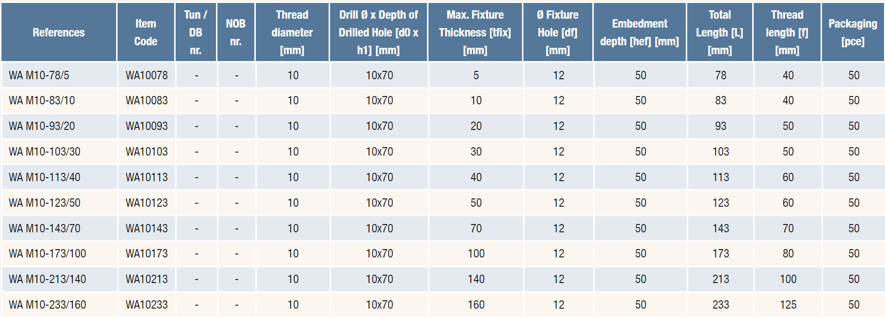 Ķīļveida enkura skrūve 10 mm diametrā no 78 mm līdz 233 mm garumā. ETA 7. apstiprināta bultskrūve vienkāršai un ekonomiskai lietošanai.