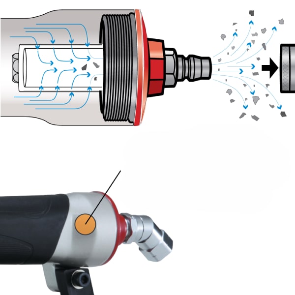 - The patented cap filter prevents foreign objects from entering the tool. The filter features a self-cleaning function: disconnecting the air hose automatically expels foreign substances from the tool.