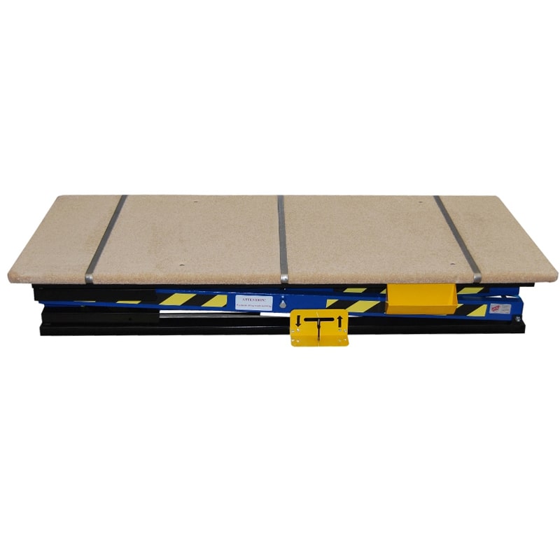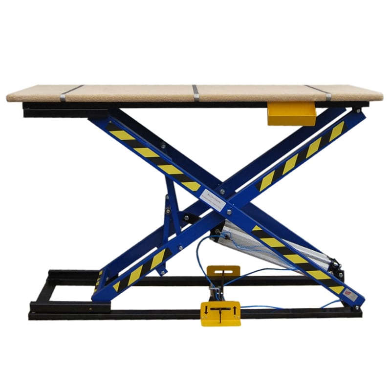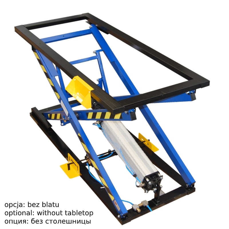 Steel table construction. The pneumatic cylinder D125x600 is foot-controlled (control from both sides of the frame). The lever system raises the tabletop to a maximum height of 1280 mm and lowers it. Metal slides are connected with a wire, the end of which is grounded, i.e., connected with the elements of the premises and equipment, ensuring the discharge of static electricity to the ground. For example, through heating equipment or water pipes. The removal of electrostatic elements prevents the occurrence of sparks and protects against fires.