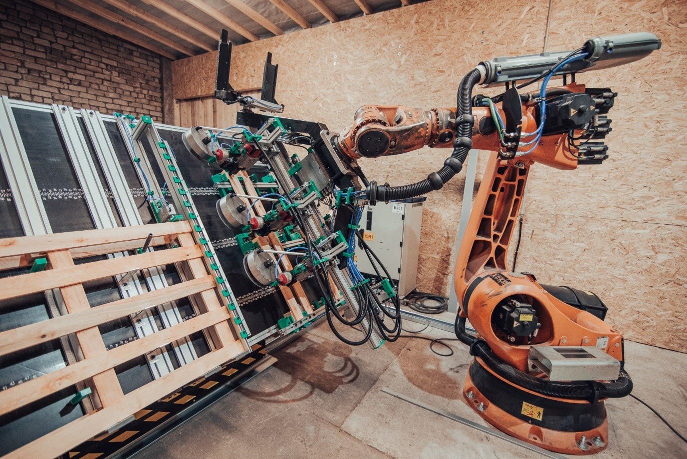 - KUKA robota roka veic gan paletes, gan palešu kāju naglošanu vienlaicīgi, kā arī paletes kraušanas kaudzē funkciju. Paletes tiek sakrautas kaudzē pēc vajadzības, arī viena iekš otras, pakas augstumu iestāda pēc vajadzības un var noteikt cik paletes tur nepieciešamas.